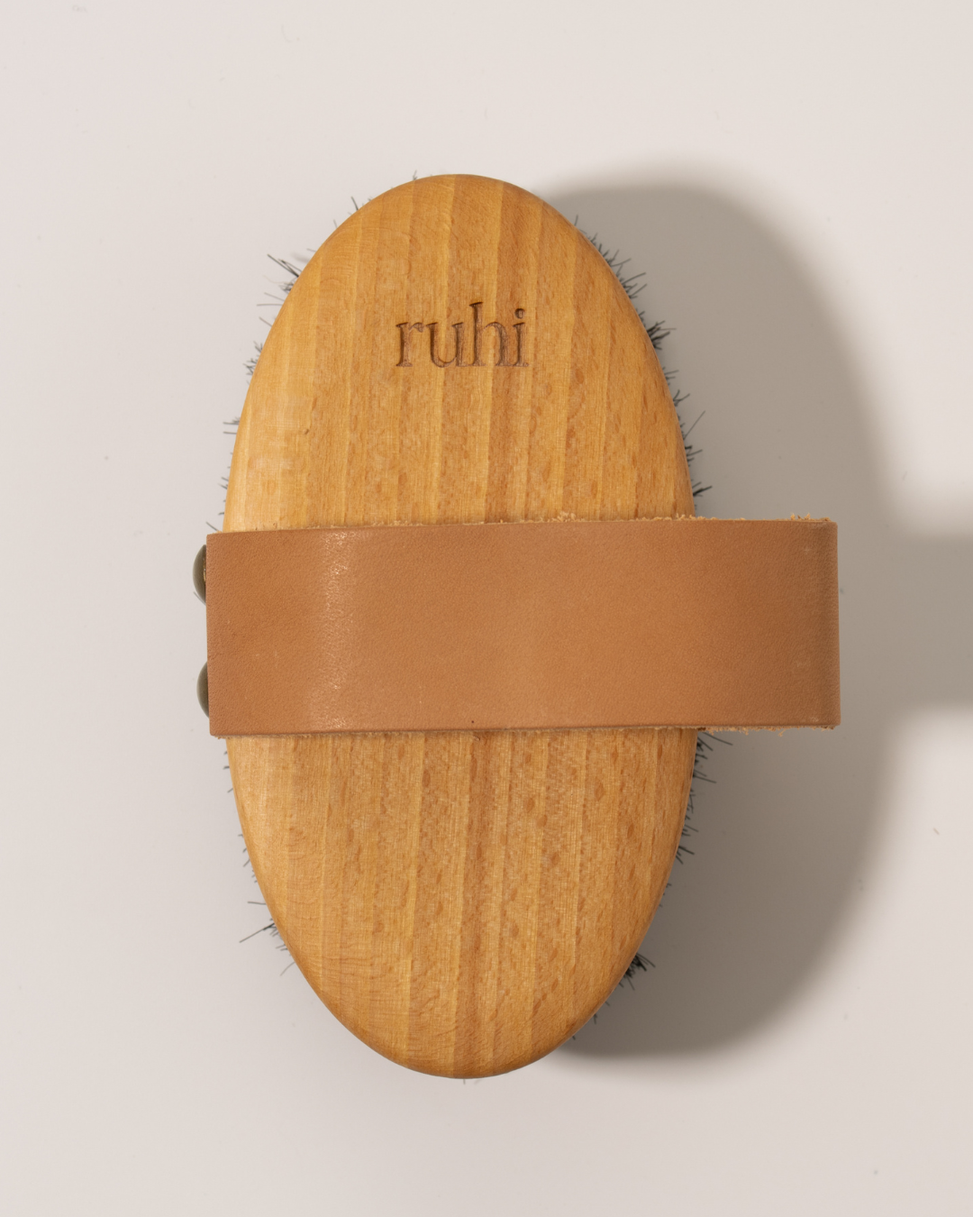Die ruhi Massagebürste besteht aus ultrafeinen Kupferdrähten, 100% Naturborsten, geöltem, regionalem Buchenholz aus verantwortungsvoll bewirtschafteten Wäldern und einer Schlaufe aus echtem Leder. Sie wird nachhaltig und auf traditionelle Weise in Deutschland gefertigt.