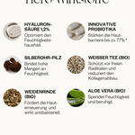 1,2% kurz-, mittel- und langkettige vegane Hyaluronsäure sowie eine pflanzliche Hyaluronsäure-Alternative aus dem Silberohr-Pilz optimieren den Feuchtigkeitshaushalt der Haut.