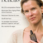 Das Retinal Serum enthält 83% zertifizierte Bio-Inhaltsstoffe und ist frei von austrocknenden Alkoholen und Duftstoffen für beste Verträglichkeit.