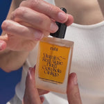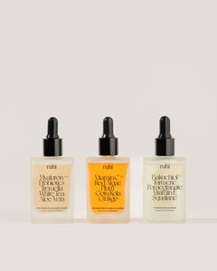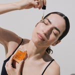 - Befeuchte deine Haut mit Wasser oder mit einem milden Toner (wie unser Adaptogen Toner Serum). Das Öl-Serum sollte immer auf leicht feuchte Haut aufgetragen werden, denn so kann es am besten einziehen und die Feuchtigkeit in der Haut einschließen.